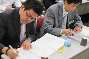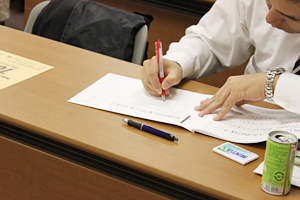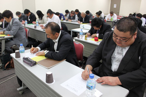 ![]() 一字一句聞き逃さないよう、 真剣にノートに筆記する参加者。 |
