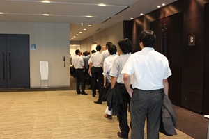 ![]() 九段のセミナー会場で。最前列をとるために、 受付には毎回行列ができる。 |
